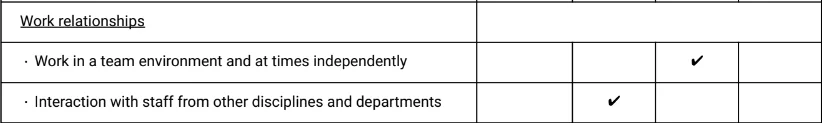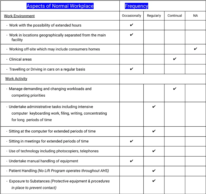 AHS provides a safe working environment for staff as part of the process Risk Assessments have been carried out and this position could include some or all of the following. (All areas marked, e.g. X or ✔, to those that apply to this position)